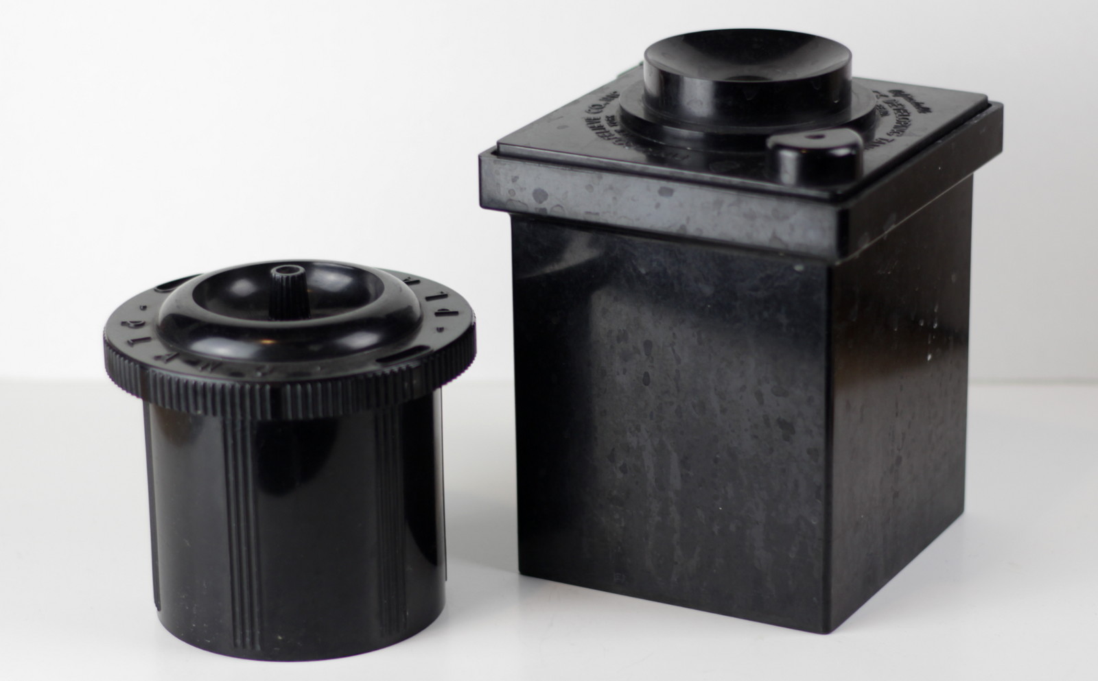 I am lucky to have inherited a good bit of old photography stuff. Both of these tanks were used by my grandfather many years ago. The square tank is a 4×5 cut film tank that will work for processing super 8 or you can stuff maybe 1/3rd of a roll of 16mm in there, but it won’t turn out very well.